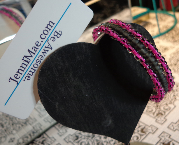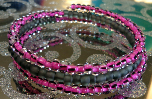 3 layer wrap bracelet with pink and black shiny, and black matte beads. Bracelet will adjust to any size.