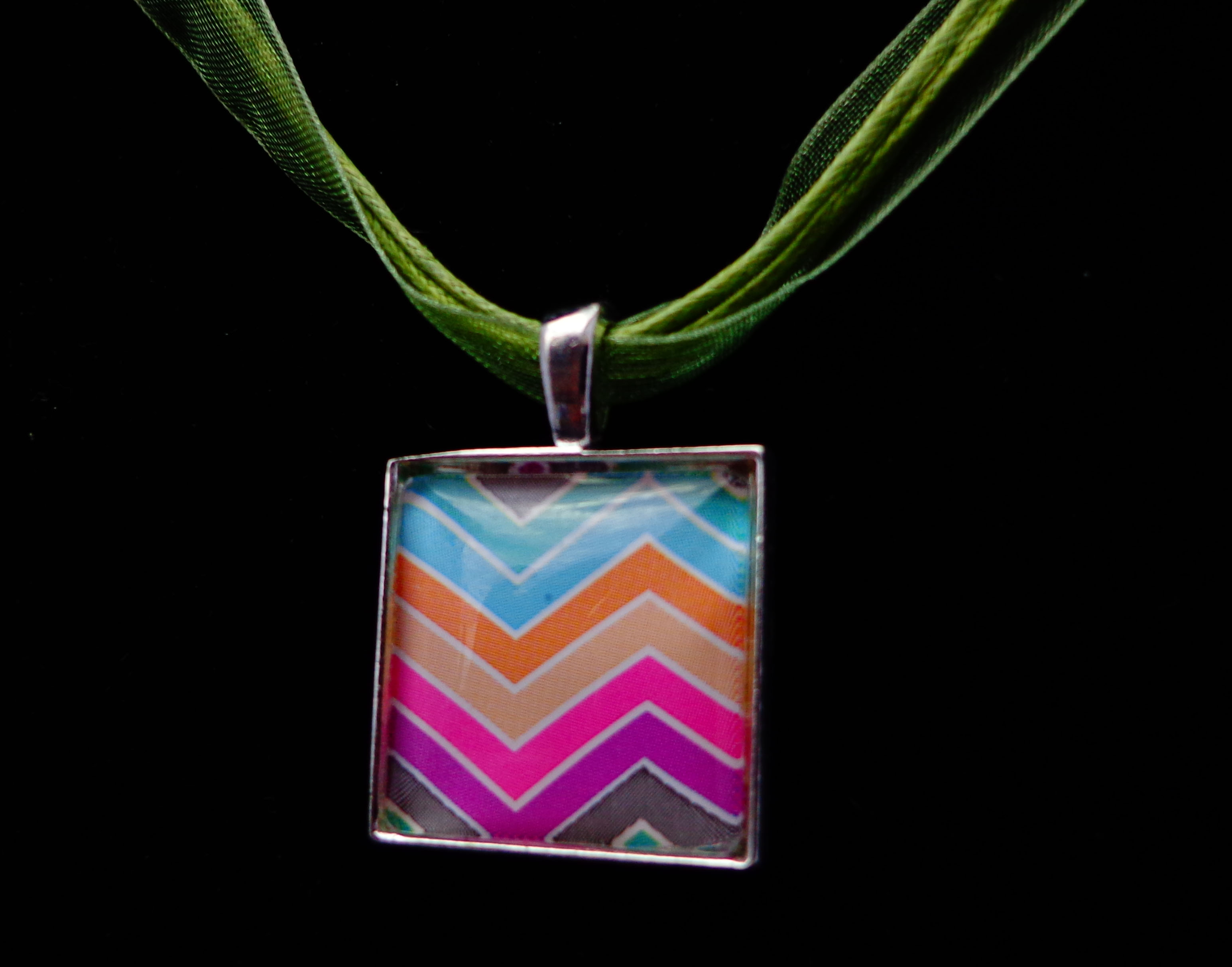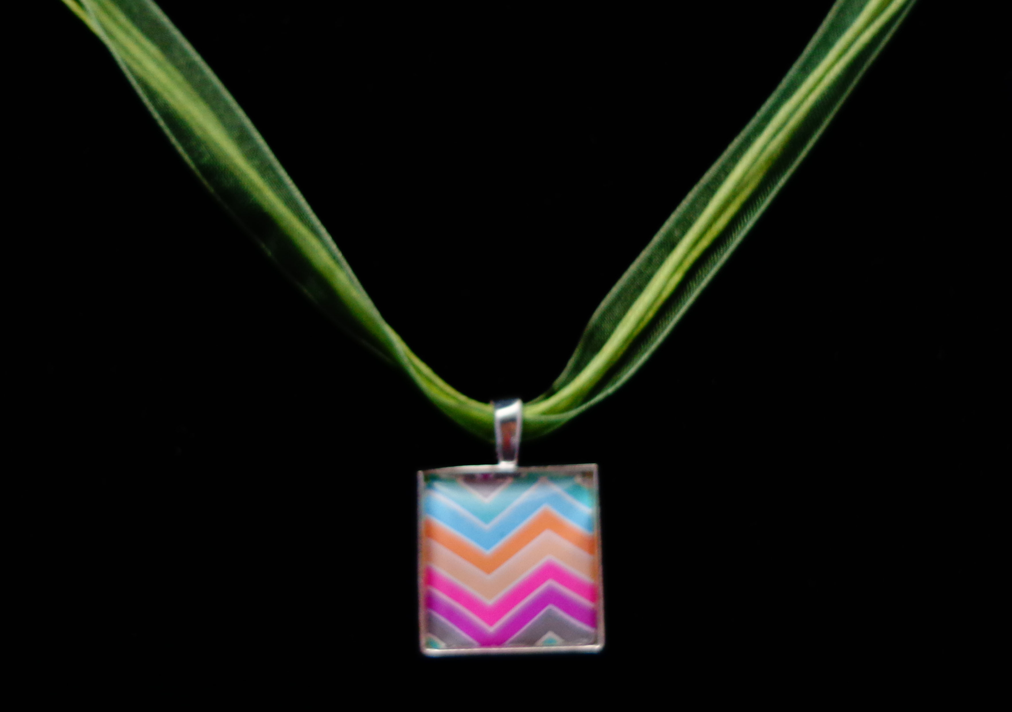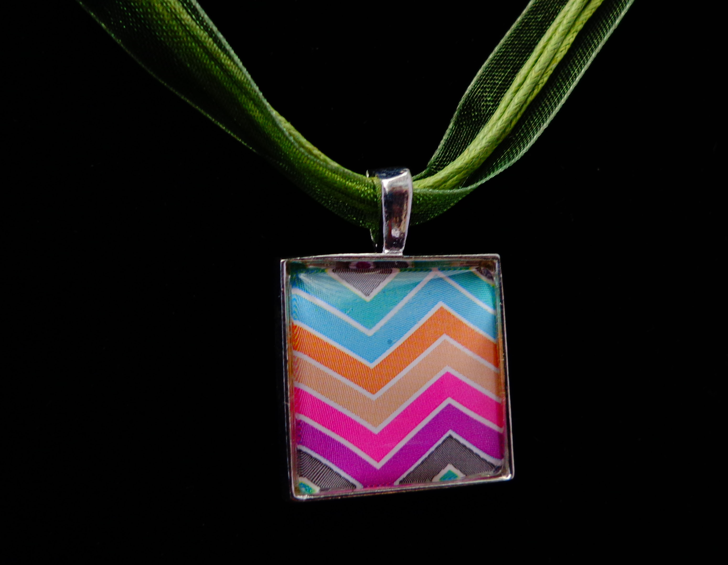 - 3/4 inch silver tile - Rainbow chevron pattern - Green ribbon and cord, adjustable from 17-19"