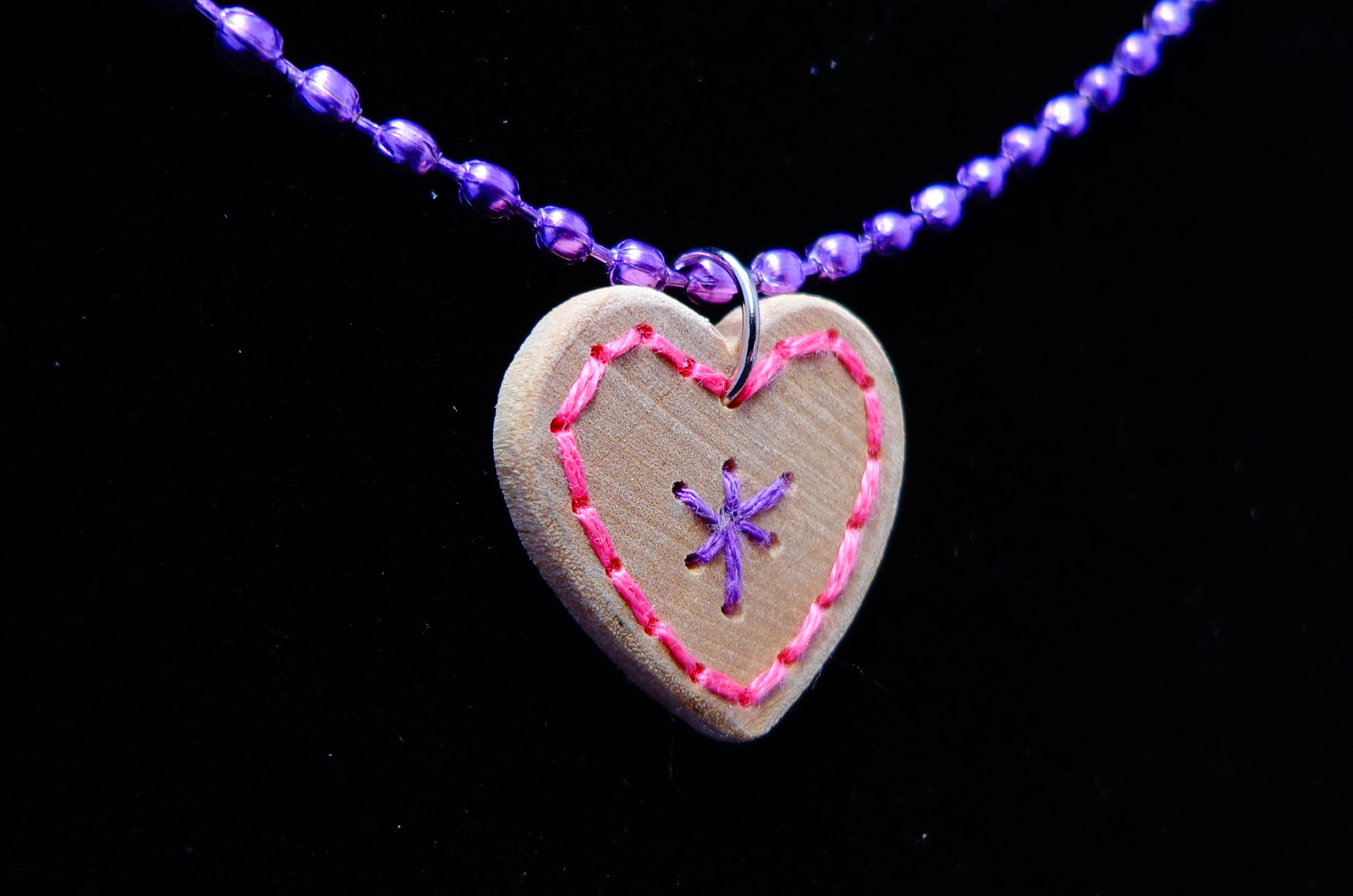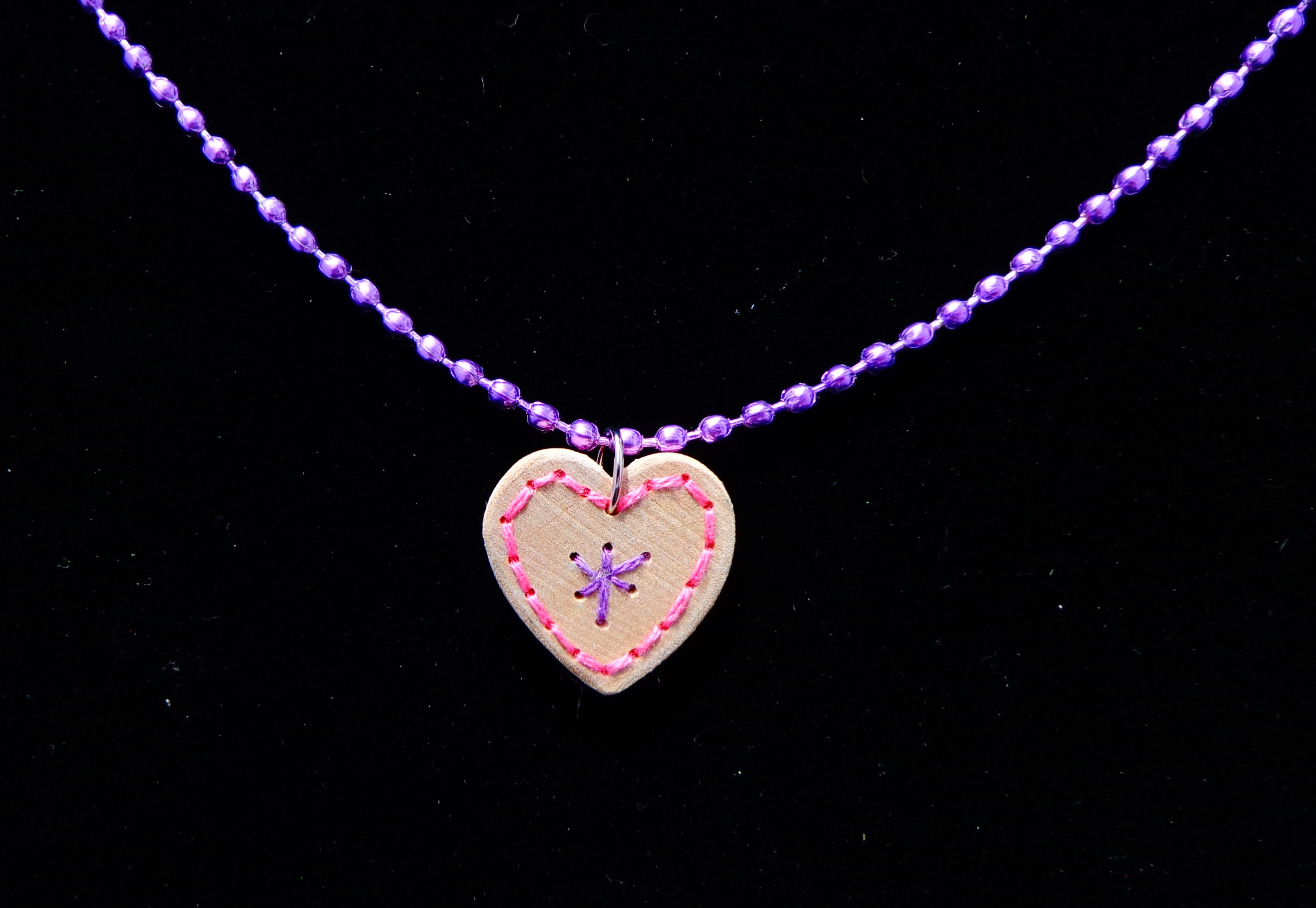 roughly 1 inch wooden tile that I hand sanded, dremeled and embroidered. Pink w/ a purple burst in the center. On a purple ball chain, roughly 19"